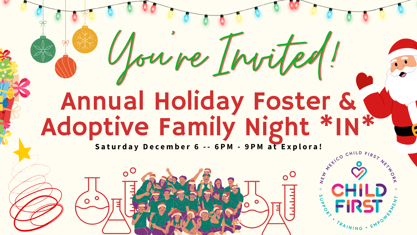 Join New Mexico Child First Network once again for our annual night-in for foster, kinship, guardians and adoptive families at Explora! Saturday December 6pm from 6pm-9pm. This is a no-cost event full of fun activities, community resources, free pizza, hot cocoa, pictures with a REAL Santa, and more!